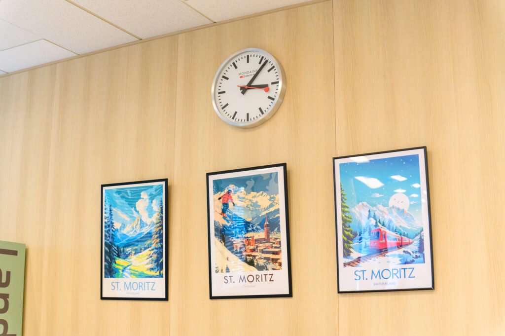それぞれの会議室には「Eiger(アイガー)」「Matterhorn(マッターホルン)」など本社があるスイスの山の名前を付け、また壁の色を変えるようにしています。山は頂点を目指して登るイメージがあるので「社員が協力して頂上を目指す」という思いを込めたものです。会議室Aのような番号や記号ではなく、「Eiger」などの山の名前を付けることで、親しみが湧きやすくなります。また、「Eigerは青い壁の会議室」といったように、視覚的な特徴と名前が結びつくことで、自分が今どこにいるのかをすぐに認識できる点も利点です。