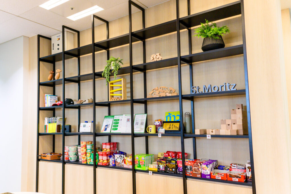 カフェスペースには、ドリンクディスペンサーや、スナックが購入できるミニバーも設置しました。海外オフィスからの出張者も、QRコードを読み込むことで自身のスマートフォンから決済できるため、使いやすいと好評です。