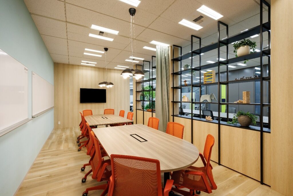 例えば、社内用会議室はクローズドな空間を多く設けるのではなく、あえて壁のない開放的なデザインにしました。壁がないため、会議の声が周囲の業務を妨げないよう注意が必要ですが、従業員同士が自然に接する機会を増やすことを目的とし、このような形に落ち着きました。