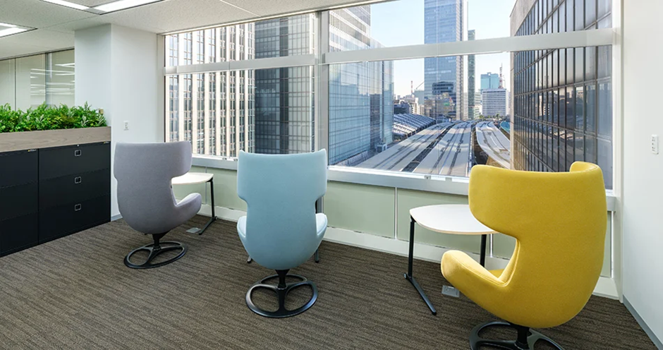 岡谷鋼機株式会社 東京本店|短時間で整う窓際カラフルチェア