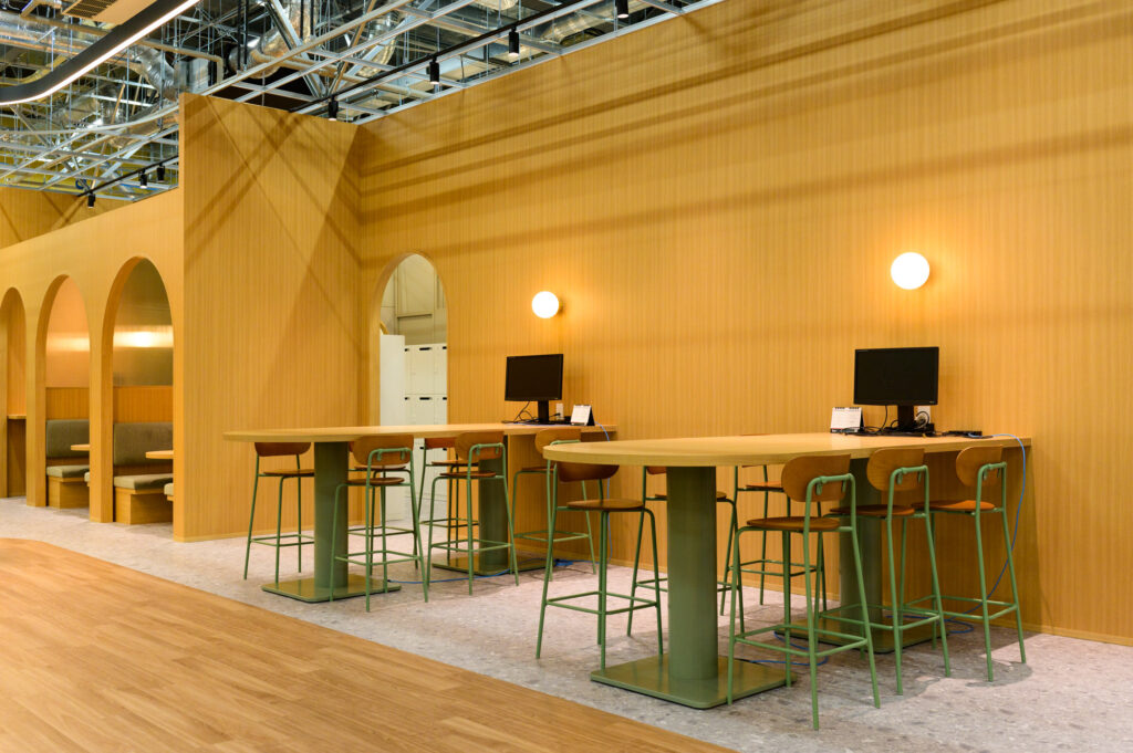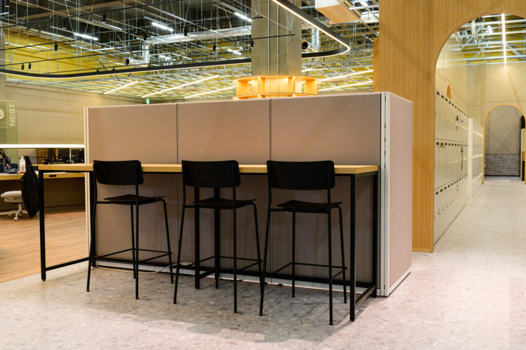 紺野:スタンディングの席もありますので、立ったままの打ち合わせも可能です。ちなみに、この席では作業も可能なので、腰痛などで椅子に座るのがキツい時に利用している従業員もいますね。