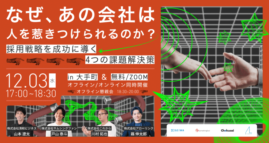 本セミナーでは、「なぜ、あの会社は人を惹きつけられるのか?」をテーマに、採用戦略を成功に導くための具体的な「4つの課題解決策」を、各分野のプロフェッショナルである4社が徹底解説します。
